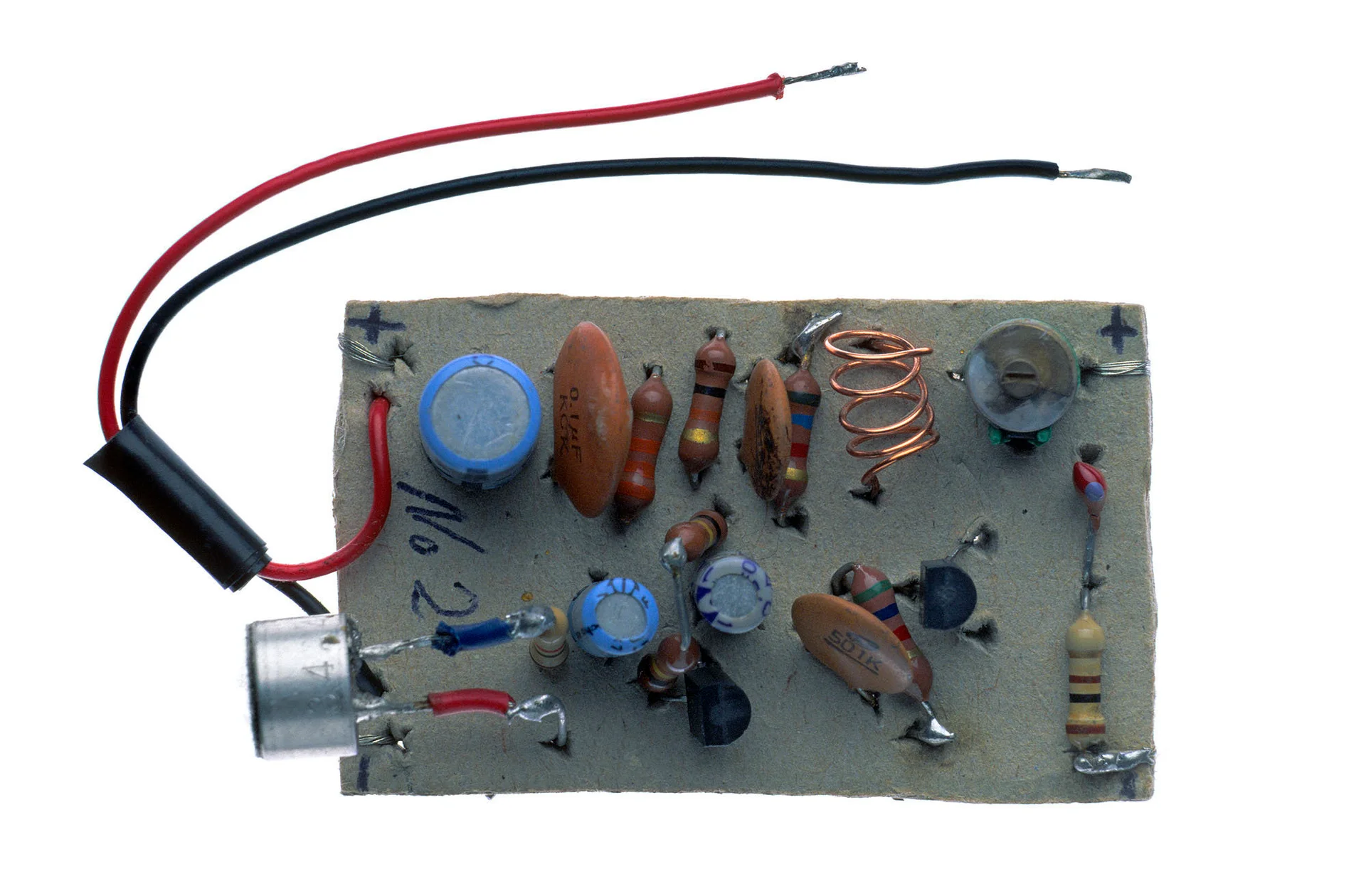 Audio transmitter or bug made of radio recorder parts by an inmate of Wolfenbüttel prison, Germany (battery is missing). Prisoners occasionally manage to install gizmos like this one in guard-rooms to be prepared for upcoming cell searches. Also suitable as a means of cell-to-cell communication among inmates. A standard radio serves as a receiver.